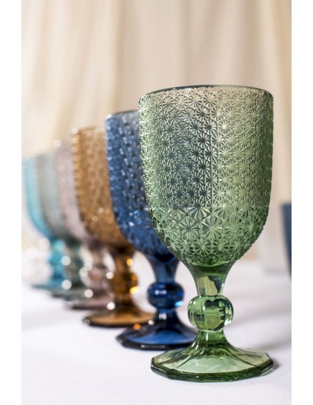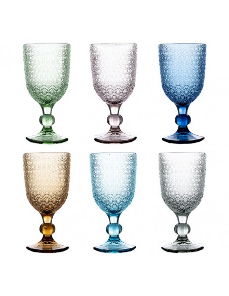 Il set di calici Mozart è adatto ad una tavola originale. Pratici e colorati i 6 calici sono realizzati in pasta di vetro con motivo geometrico a rilievo.