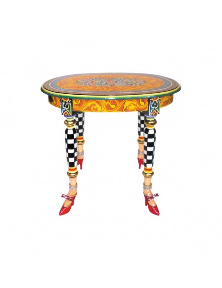 Tavolino ovale in legno (MDF) dipinto interamente a mano, con le caratteristiche scarpette rosse.